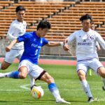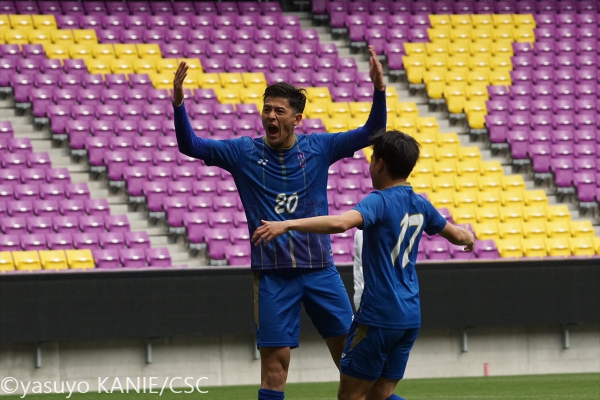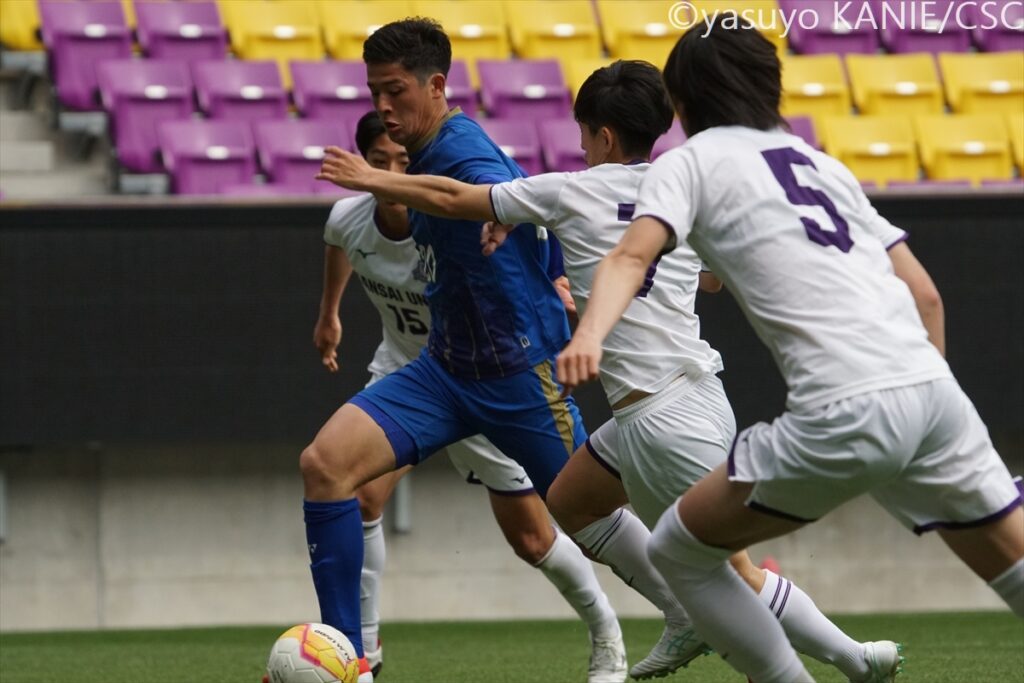 前年度のリーグ戦で優勝を争った2チームの対戦は、2025シーズンの幕開けに相応しい熱戦となった。試合は18分にMF三木仁太(4年/ガンバ大阪ユース)の得点で先制した関西大が主導権を握って前半を進めるが、阪南大も後半はしっかりと修正し、幾度も関西大のゴールへ迫る場面を作っていく。すると80分にMF山田晃市(3年/四国学院大学香川西高)が左サイドからゴール前へと上げたクロスを、FW中田有祐(3年/ベガルタ仙台ユース/仙台内定)が打点の高いヘディングで叩き込み、阪南大が同点とする。その後は両チーム、決定機を作りながらも決めきれず、オープニングゲームはドロー決着となった。