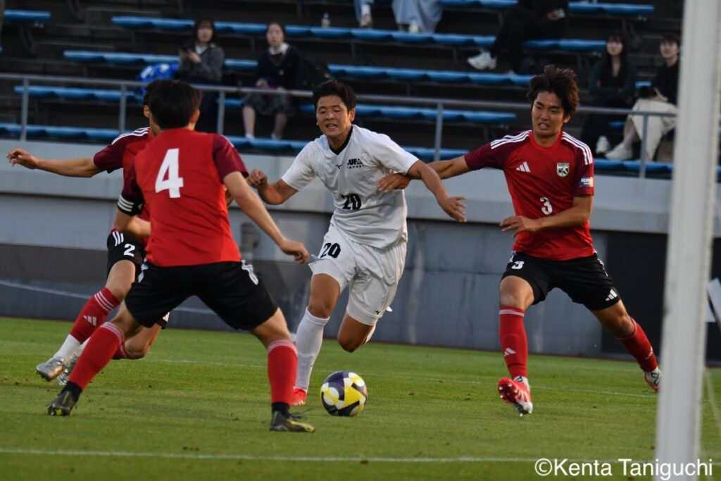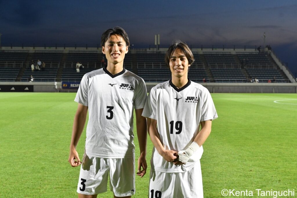 GK宮本流維(関西学院大4年/名古屋グランパスU-18)、DF赤熊大和(甲南大3年/就実高)、DF有吉勇人(甲南大4年/広島県瀬戸内高)が後半から投入。攻撃陣は、右MFを山本青英(大阪経済大3年/東海大学付属大阪仰星高)が務め、FW水永直太朗(大阪経済大2年/東海大学付属大阪仰星高)とFW中田が2トップ気味となる布陣が敷かれた。