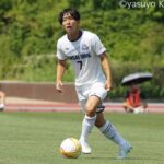 後半も前半同様に背後を狙う姿勢を崩さない京産大は、前線からのボール奪取を狙い、ラインを高い位置で維持し続けた。ウイングバックを任されたMF滝口晴斗(3年/サンフレッチェ広島F.Cユース)は、50分にインターセプトでボールを奪うと右サイドから好機につなげていく。58分、ファーサイドでボールを要求するMF末谷誓梧(3年/セレッソ大阪U-18)へMF滝口がロングパスを供給すると、MF末谷が頭で折り返したボールをMF長谷川が体勢を崩しながらも左足を振り抜き、先制ゴールを決めた。「ゴールを意識してプレーしている中でいいボールがこぼれてきたので、流し込むだけだった」と長谷川は得点シーンを振り返る。