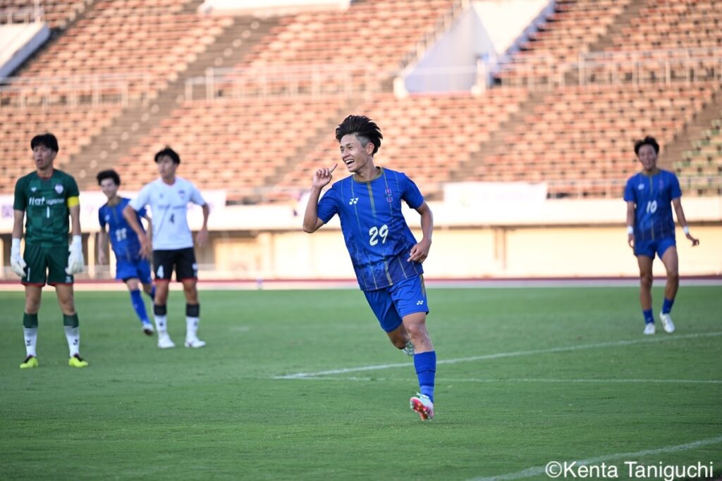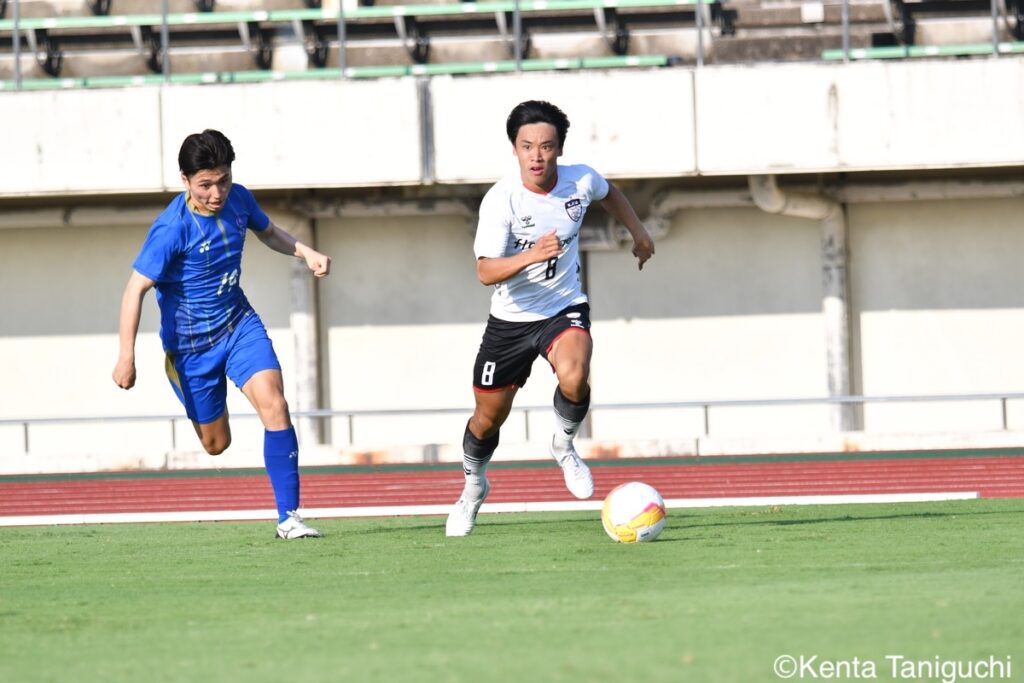 開始早々に、京産大が試合を動かした。4分、左サイドを駆け上がったMF末谷誓梧(3年/セレッソ大阪U-18)が中に切り込みゴール前にボールを送ると、ディフレクションにより先制ゴールが生まれた。「ゴールを狙った形ではないけど、自分が攻撃を仕掛けることで得点の匂いが生まれると思うので、自分の特徴を出すことを意識しました」と先制の場面を振り返った末谷は、ドリブルを仕掛けてゴールに迫るシーンをその後も創出したが、自身の総シュート数2本という結果に「もっと良い選択肢があったかもしれないですけど、自分が決め切るというところは試合前も強く思っていたので。シュートの質はもう一個上げていかないといけない」とフィニッシュの質を反省点として挙げた。