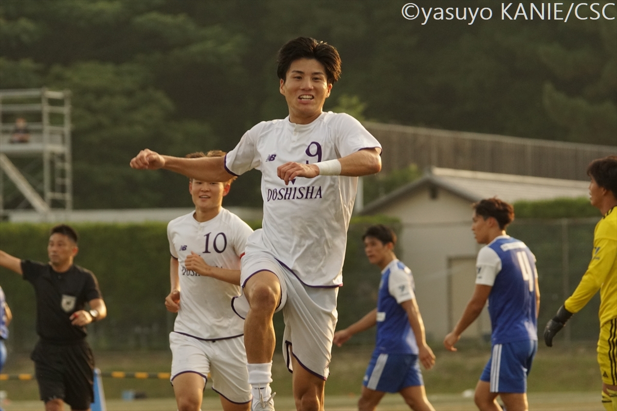 ホームグラウンドで躍動して、関西学院大に初黒星をつけたのが同志社大だ。立ち上がりから強度の高いプレスで関学大のパスワークを封じると、8分、DF渡邉良(3年/草津東高)が左サイドでMF中山織斗(3年/國學院大學久我山高)とワンツーで深い位置まで侵入してゴール前に入れたボールをFW野頼駿介(3年/桐光学園高)が決めて先取点とする。同志社は30分、FW鹿取勇斗(4年/桐光学園高)のCKからMF馬場啓太朗(4年/大阪桐蔭高)がゴールを脅かすシュートを放つが、ここは関学大GK宮本流維(4年/名古屋グランパスU-18)が防ぎ切る。前半、効果的な攻撃を構築できなかった関学大は後半頭からMF篠原駿太(4年/神村学園高等部)、DF金山耀太(2年/近江高)を投入し、サイド攻撃で追撃を狙うが、速いプレスと身体を張った守備の前にシュートを打つ展開に持ち込めない。同志社大もセットプレーから好機を作るが、追加点は奪えないまま試合終了。同志社大が上位チームとの差を詰める勝ち点3を獲得した。