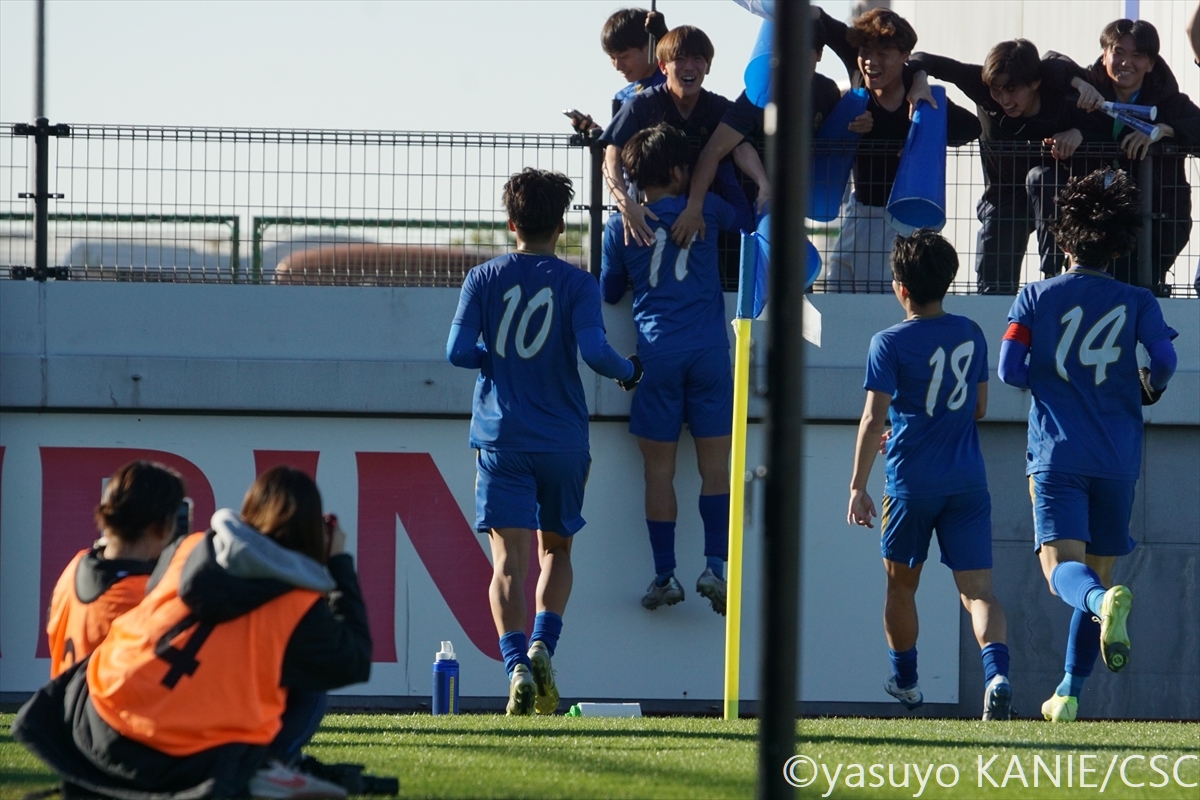 まず試合の主導権を握ったのは、阪南大。速いプレッシャーからボールを奪取すると、一気に鹿屋大のゴールへ迫る。鹿屋大・塩川勝行監督は「向こうのペースで巻き込まれてしまって、展開としては苦しかったかな」と振り返ったようになかなか攻めに出る場面を作れないが、その状態でもしっかりと耐えて阪南大にゴールを許さない。だが44分、MF松井空音(1年/帝京大学可児高)が相手からボールを奪うとFW坪井風汰(3年/東邦高)とのワンツーから中央へパス。これに走り込んだMF櫻井文陽(4年/阪南大学高/群馬内定)が鹿屋大DF2枚の間を通したスルーパスにMF山田晃市(3年/四国学院大学香川西高)が抜け出し、GKとの1対1を制して先制点を奪う。